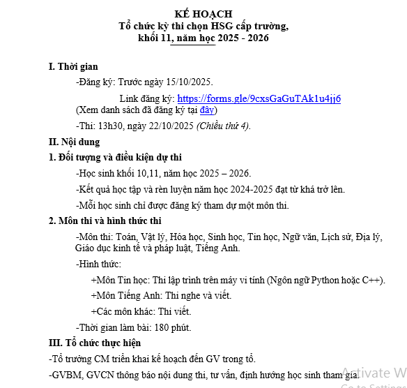 Kế hoạch thi HSG lớp 11, NH 2025 - 2026