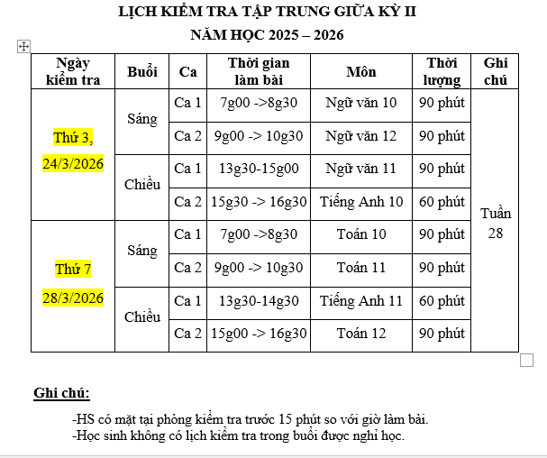 Kế hoạch kiểm tra cuối kỳ I, NH 2025-2026