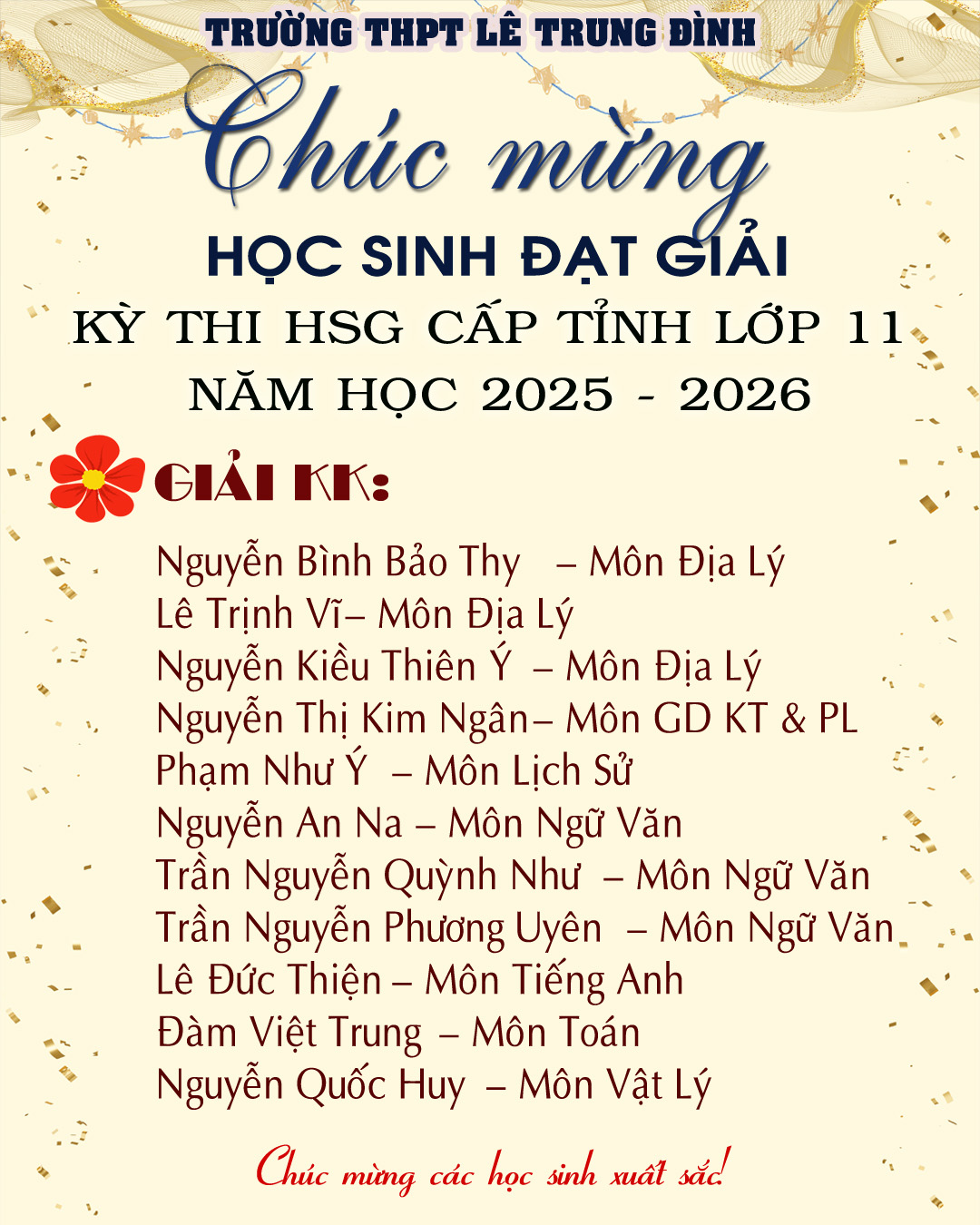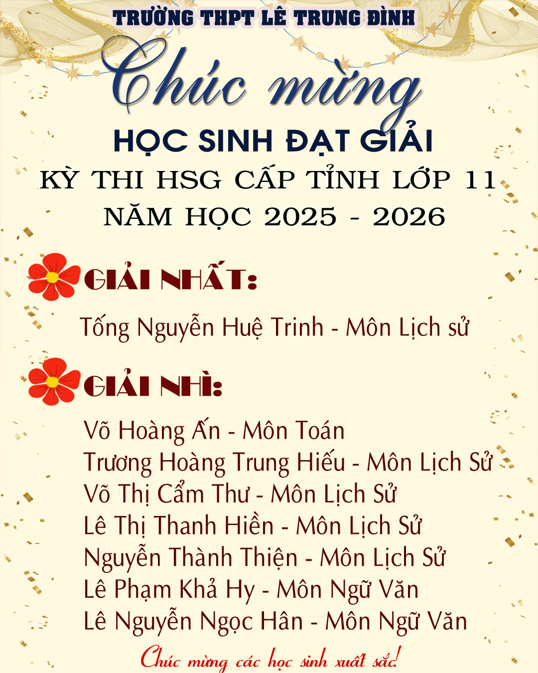 Nhà trường ghi nhận và biểu dương thành tích của các em học sinh đã đạt giải; đồng thời trân trọng cảm ơn quý thầy cô giáo và phụ huynh đã luôn đồng hành, hỗ trợ các em trong suốt quá trình học tập.