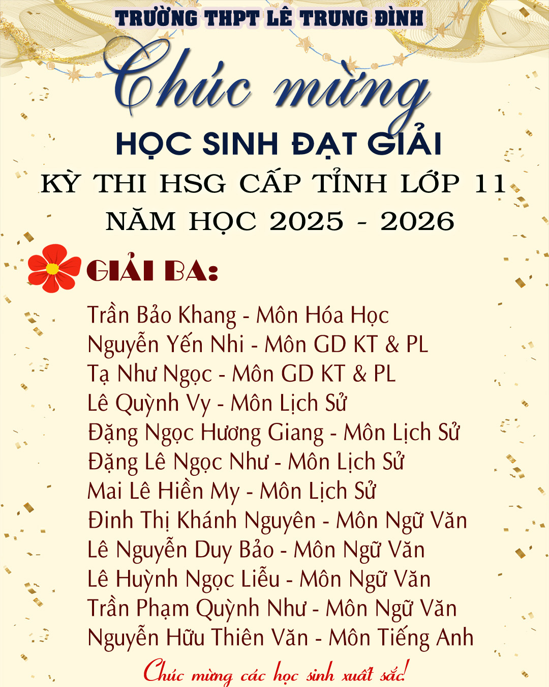 Danh sách học sinh dạt giải trong kỳ thi chọn HSG cấp tinh lớp 12, NH 2025-2026